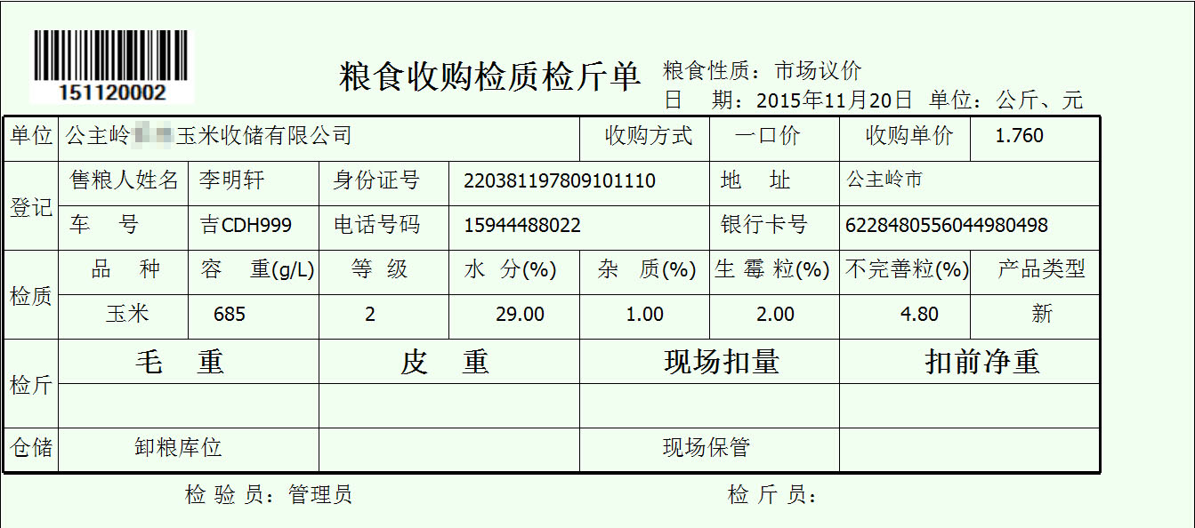 网络版化验环节新增粮食收购检质检斤单,单据号按日期自动生成,可打印出条形码,以此做为整个收粮过程流转凭证。如图: